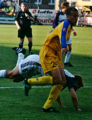 Das "Elferfoul" an Gernot Plassnegger (der Schiedsrichter setzt bereits zum Elferpfiff an)