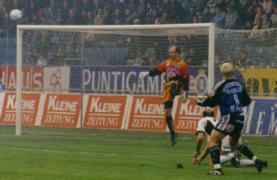 Die größte Chance im ganzen Spiel: Mayrlebs Stangenschuß nach nur einer Spielminute (hier der bereits von der Stange abspringende Ball)